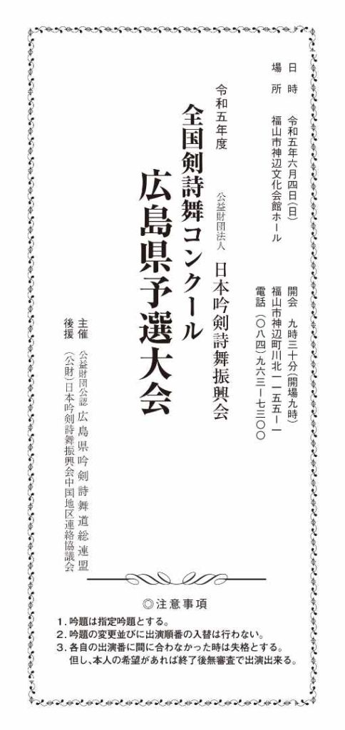 日時 令和5年6月4日(日) 開会 9時30分(開場9時) 場所 福山市神辺文化会館ホール 大会プログラムPDF 大会・コンクール よかったらシェアしてね! URLをコピーしました! URLをコピーしました! 関連記事 【結果発表】令和七年度 中国地区代表選出 全国剣詩舞コンクール中国地区大会 2025年7月22日 【結果発表】令和七年度 中国地区代表選出 全国吟詠コンクール中国地区大会 2025年7月9日 令和七年度 中国地区代表選出 全国剣詩舞コンクール中国地区大会 2025年7月3日 令和七年度 中国地区代表選出 全国吟詠コンクール中国地区大会 2025年7月3日 【結果発表】令和七年度 全国吟詠コンクール 広島県予選大会 2025年5月18日 【結果発表】令和六年度 全国吟詠コンクール 広島県予選大会 2024年5月27日 令和六年度 全国吟詠コンクール 広島県予選大会 2024年5月5日 【結果発表】令和五年度 全国吟詠コンクール 広島県予選大会 2023年5月30日